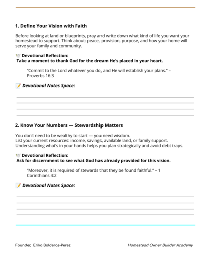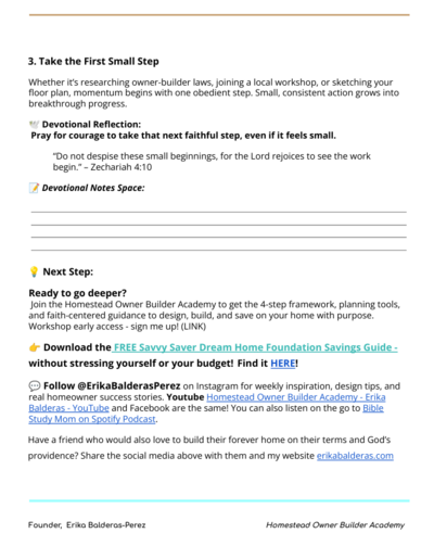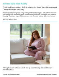 This FREE devotional download gives practical steps and spiritual guidance to begin building your home and your legacy — with confidence and wisdom. Here is where your Homestead Owner Builder Journey Faith-filled foundations meet practical planning. These three steps will help you move from dreaming to doing right where you are!